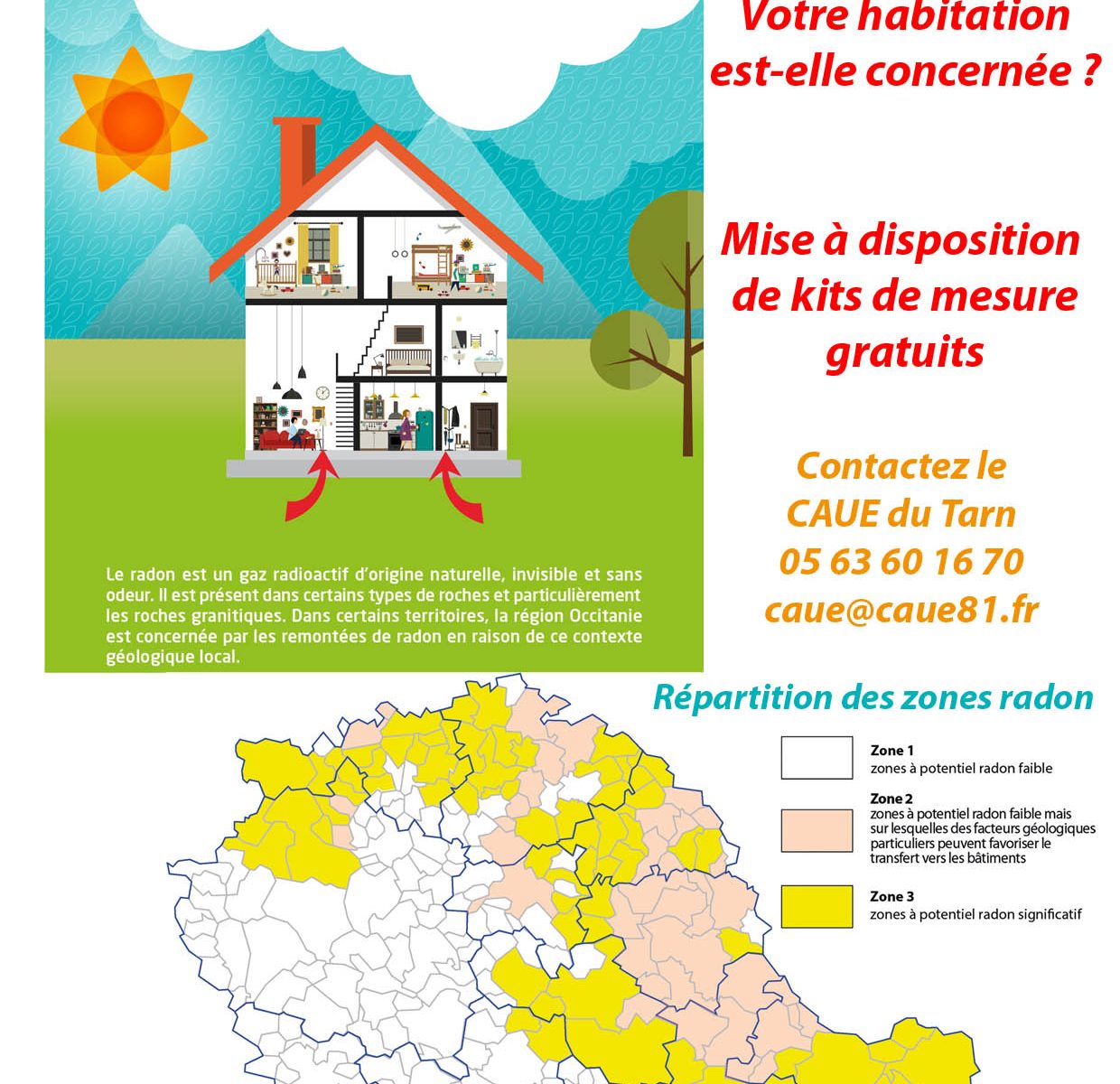 L’Agence Régionale de Santé (ARS) a missionné le CAUE du Tarn (Conseil d’Architecture d’Urbanisme et d’Environnement) pour mener une campagne de mesure du gaz RADON pour l’hiver 2025 / 2026, chez les particuliers volontaires situés sur des communes classées en zone 3 (zones à potentiel radon significatif).
