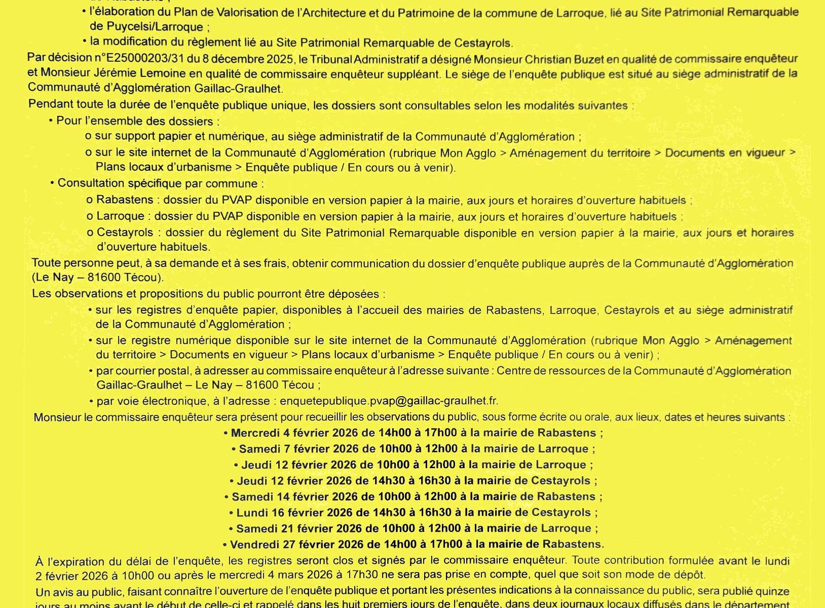 Le dossier d’enquête est à votre disposition aux heures d’ouverture de votre mairie pendant toute la durée de la procédure du lundi 2 février 2026 à 10h au mercredi 4 mars à 17h30. Vous pouvez également consigner vos remarques sur le registre d’enquête ouvert à cet effet.